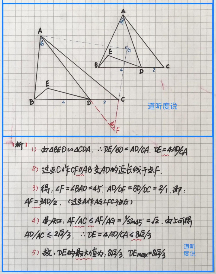 【析】首先,由相似三角形转化为:DE=4(AD/CA),求(AD/CA)的最值;然后,知45°角和BC边上分点D,作平行线移动已知角和分线段;最后,在含已知角的三角形中,根据角的正弦意义和“斜大于直”,得线段比最值…具体求解过程如下:
