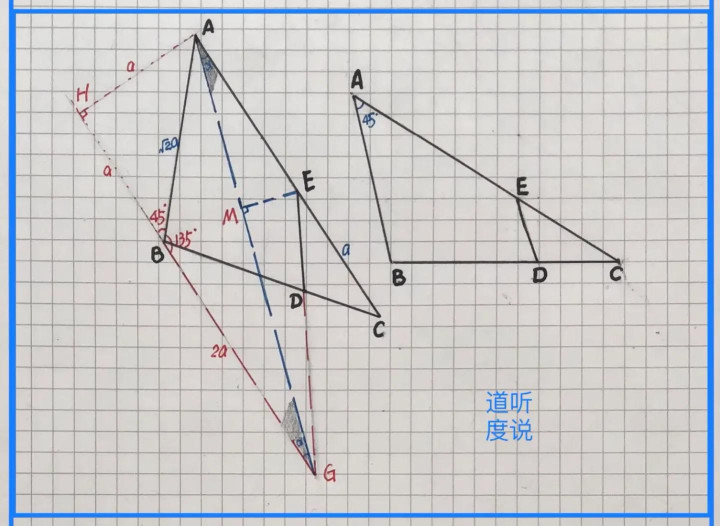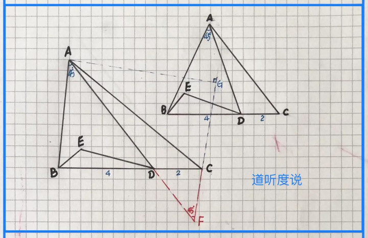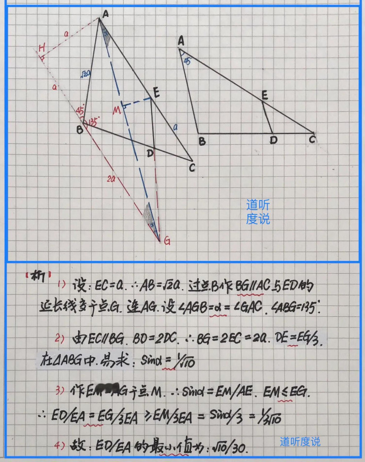 【例2】(如图)△ABC,∠BAC=45°点D在边BC上,且BD=2DC,点E在射线CA上,且√2EC=AB,连DE,求ED/EA的最小值