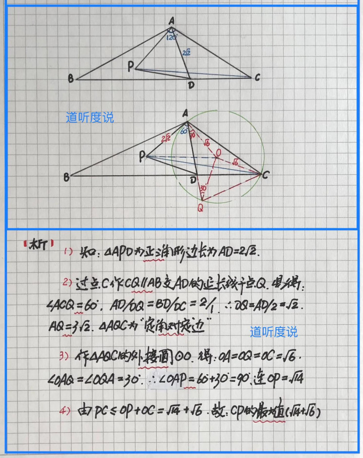 【例1】(如图)在△ABC中,∠BAC=120°,边BC上一点D,满足BD=2DC,AD=2√2,将AD绕点A顺转60°得AP,求CP的最大值